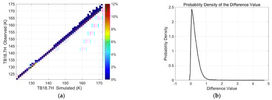 A 2-D histogram of the observed brightness temperature versus the simulated brightness temperature at the horizontal polarized MWRI-RM channel of 18.7 GHz (a) and the probability density distribution (PDF) of the difference between the observed brightness temperature and the simulated brightness temperature (b).