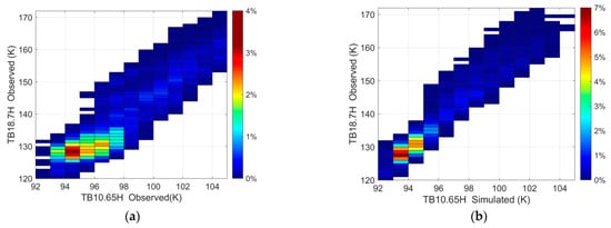 A 2-D histogram of the observed brightness temperature at the 18.7 GHz channel versus the observed (a) and the simulated (b) brightness temperatures at the 10.65 GHz channel.