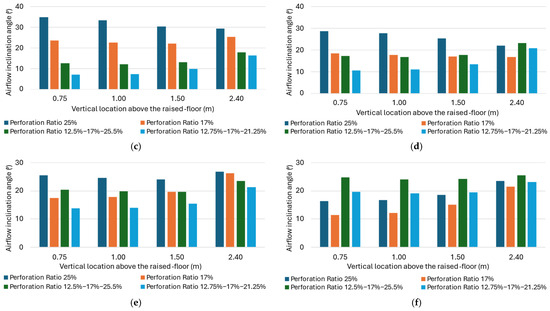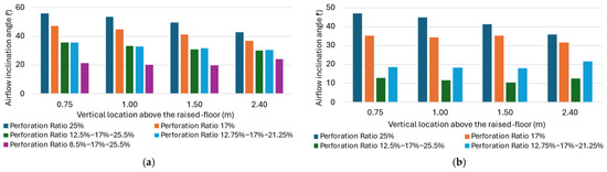 | Perforation Opening Ratio | Airflow Inclination Angle at the Vertical Location Above the Elevated Floor (m) | |||