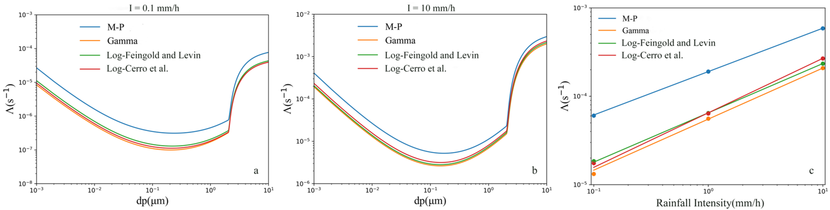 2.3. The Influence of Raindrop Size Spectrum on the Scavenging Coefficient