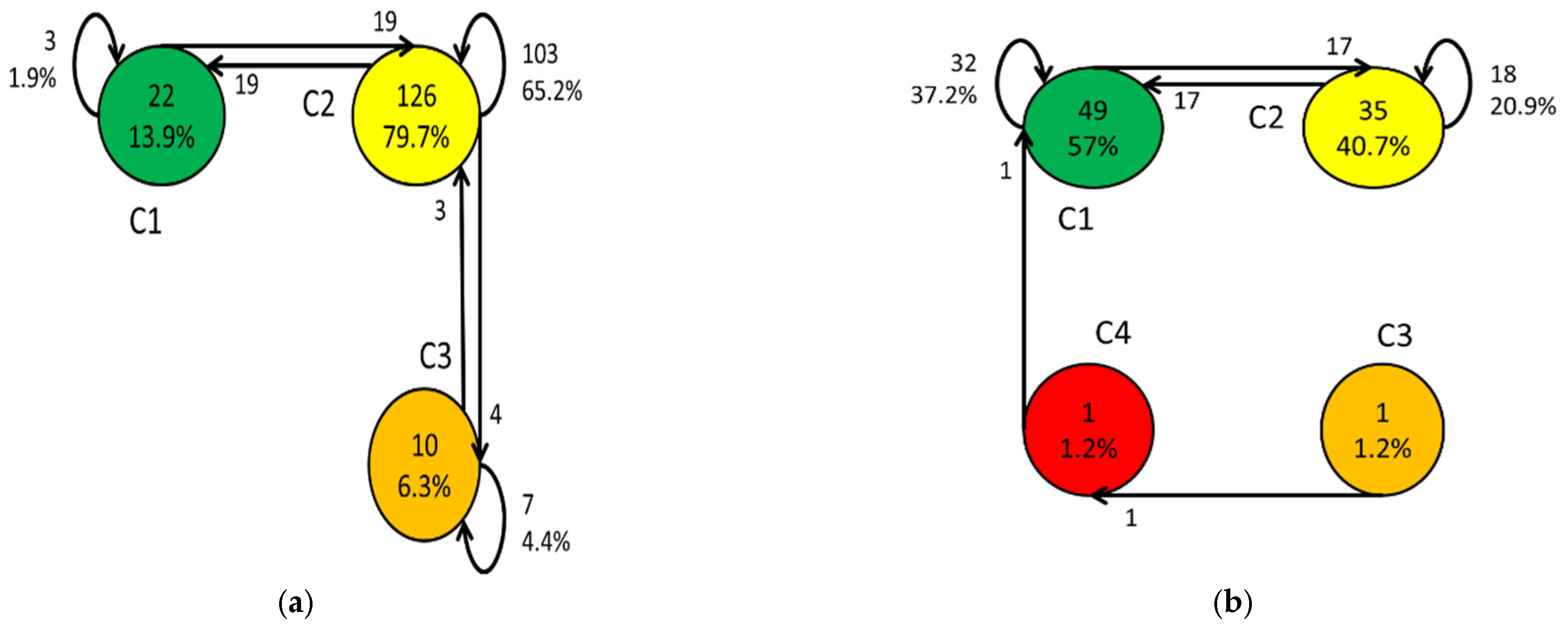 A raw transition matrix RT = [RTj k], where RTj k is the number of transitions observed of class j and class k Equation (5). The diagonal terms RTj j indicate the number of records in class j, i.e., the number of instants or recording times the system was in this class.