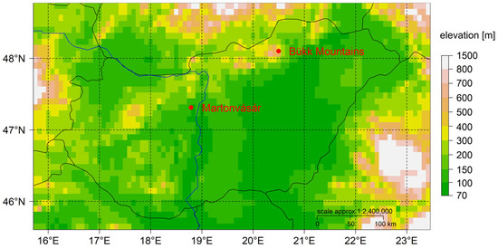 Topographical map of Hungary (the arrow ↑ points north), Martonvásár (47.3° N, 18.8° E), and Bükk Mountains (48.1° N, 20.5° E), the locations of weather observations during clear-sky mornings.