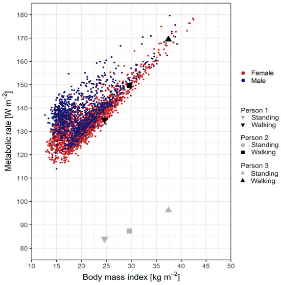 The following relationships and basic information can be seen: (1) The M–BMI point clouds of walking men and women overlap, but men’s M values are somewhat larger than women’s M values. (2) For pedestrians, M increases with increasing BMI. (3) The rate of increase is maximum (30 W m−2/15 kg m−2), which is 2 W kg−1. Person 1 is represented with a triangle directed downwards in Figure 2. His M value during walking at a speed of 1.1 m s−1 is 135 W m−2. Person 1 was chosen because his M–BMI point (M = 135 W m−2, BMI = 24.4 kgm−2) is about in the middle of the M–BMI point cloud. It should also be noted that the M value of person 1 while walking is very close to the M value of the “standard human” while walking used in the PET (Physiologically Equivalent Temperature) and UTCI (Universal Thermal Climate Index) indices. These M values are 135, 141.3, and 144.2 Wm−2 for person 1, PET, and UTCI indices, respectively.