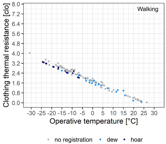 Comparing Figure 3 and Figure 4, we can see that the marked difference between the two figures is in the slope of the point arrangement. In the case of standing person 1, the rcl values varied between 0 and 6.8 clo, and the corresponding To values between 28 and −25 °C (this is the same as the To limits shown in Figure 2). The rcl differences between a standing and a walking person increase linearly with increasing heat deficit. In cases of the smallest heat deficits (close to 0 clo), this difference is only a few tenths of a clo, in cases of the largest heat deficits (thermal sensation type “very cold”) the difference is around 3 clo; that is, approximately as big as the annual fluctuation of the rcl values of person 1. From this point of view, rcl sensitivity to activity is very high.