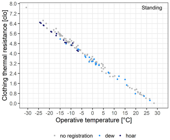 The rcl values varied between 0 and 3.5 clo, the corresponding To variation is between 27 and −25 °C. The annual value of the rcl in the lowlands is 0.6–0.8 clo, so the annual fluctuation of the rcl values of mornings with clear skies is five times the average annual value. In cases of the smallest heat deficit (near 0 clo), the thermal sensation is “neutral”, while in cases of the greatest heat deficit, the thermal sensation is “very cold” [22]. It should be emphasized that the thermal sensation type “slightly warm” does not occur even in cases of the smallest heat deficits. We cannot say anything for certain about the frequency distribution of rcl values, since the number of registered cases is smaller than the number of realized cases. We also have a point with a value of 4.1 clo (the associated To value is −30.7 °C), which refers to the Bükk Mountains and not to Martonvásár. We will refer to this point later in Section 6. It can be observed that the mornings with the formation of dew and hoar frost are separate, although we also had cases of dew in the case of To < 0 °C. In cases involving the formation of hoar frost, the smallest observed heat deficit was around 1.8 clo. This lack of heat causes people to feel either “cold” or “very cold” [22].