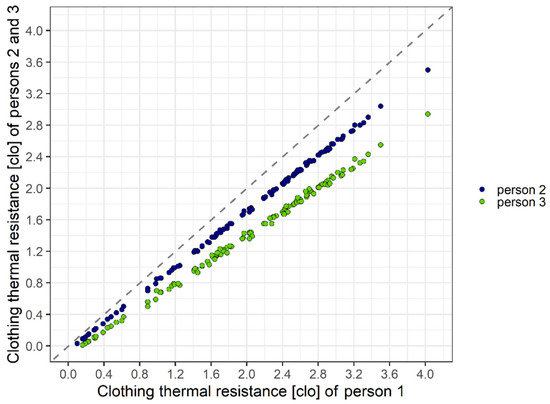 Comparison of clothing thermal resistance values referring to persons 2 and 1 (blue) and persons 3 and 1 (green). The humans are walking at a speed of 1.1 m s−1.