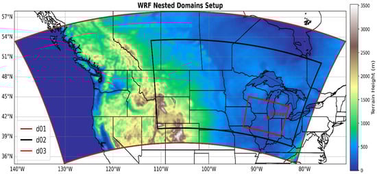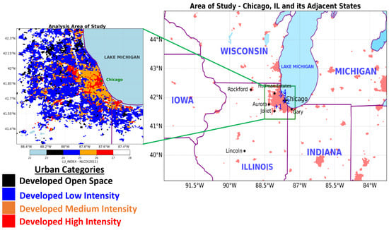 The numerical simulation experiments intercompared two simulations: the first (control simulation) from the WRF-ARW (Version 4.4) [] and the second (urban sensitivity experiment) from the WRF-UCM (Version 4.4.2) with a single-layer urban canopy []. Most of the components of these two simulations are identical except for the addition of the single-layer urban canopy and, for land use, the 40-category National Land Cover Database (NLCD 2011) [] in the WRF-UCM simulation instead of the MODIS IGBP 21-category dataset in the WRF-ARW simulation. The region of integration and one-way nested configurations are identical, covering the regions in Figure 1 with domain d01 (16 km resolution), d02 (4 km resolution), and d03 (1 km resolution). The initial and largest domain lateral boundary conditions employed the European Centre for Medium-Range Weather Forecasts Reanalysis 5 dataset (ERA5) []. The d01 ran from 7/5/0000 UTC–7/6/0600 UTC, 2018, while the d02 ran from 7/5/0600 UTC–7/6/0600 UTC, 2018, and the d03 ran from 7/5/1200 UTC–7/6/0600 UTC, 2018 (hereafter following the format: 12007/5). The grid projection is Lambert conformal; 50 vertical layers were employed, and the model top was 50 hPa. Parametrizations include the Thompson microphysics scheme []; the Mellor–Yamada–Janjic PBL scheme []; longwave and shortwave radiation (RRTMG) []; the Eta similarity scheme for the surface layer []; land surface (Unified NOAH Land Surface Model) []; cumulus parameterization [] for the outermost domain (d01 grid) only, since this scheme is scale-sensitive; and urban physics (single-layer UCM) []. Figure 2 depicts the urban categories and their distribution over Chicago for the WRF-UCM simulation. For the analysis, we focus only on the d03-simulated fields, particularly focusing more closely on the Chicago metroplex, where urban impacts are more dominant. The domain configuration of the WRF model, physics parameterization schemes, and dynamics employed for this study are summarized in Table 1.