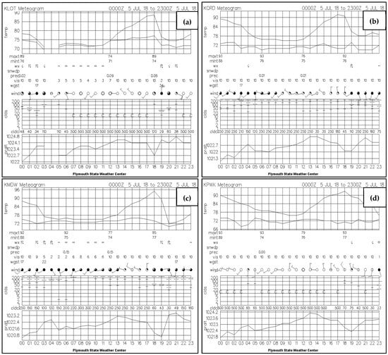 Observed surface meteograms from the Plymouth State Weather Center for four stations in the Chicago metropolitan area: (a) Romeoville, IL (KLOT); (b) O’Hare International Airport (KORD); (c) Midway Airport (KMDW); and (d) Wheeling, IL (KPWK), during the 0000–2300 UTC period on 5 July 2018. Panels show the time evolution of surface temperature (T2), height of cloud ceiling, pressure (millibars), and wind speed/direction at each location.