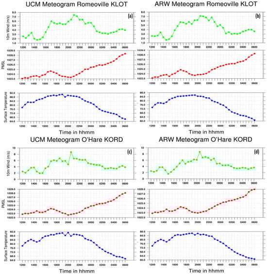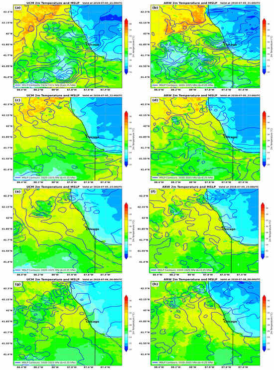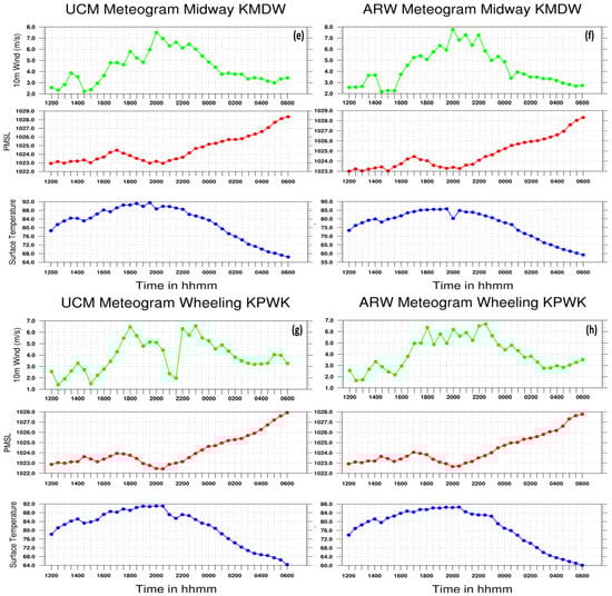 Same as Figure 3 but for simulated WRF-UCM (left) and WRF-ARW (right) at (a,b) Romeoville, Illinois (KLOT); (c,d) O’Hare Airport (KORD); (e,f) Midway Airport (KMDW); and (g,h) Wheeling, Illinois (KPWK) for the 5–6 July 2018 period.