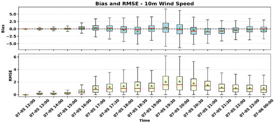 We performed a quantitative comparison of 2 m temperature and 10 m wind speed using analysis domain-averaged bias and RMSE metrics, as shown in Figure 5 and Figure 6. The 2 m temperature comparison between the WRF-UCM and WRF-ARW simulations reveals the positive values of bias across nearly all time steps, especially during the afternoon and early evening hours (1400–1900 UTC), with median values close to zero and relatively low RMSE across the domain (Figure 5). This confirms that the UCM consistently produces higher temperatures than the baseline ARW simulation, which is consistent with the expected urbanization effect, where enhanced surface heating and reduced evaporative cooling in urban environments contribute to higher near-surface temperatures. Overall, the UCM simulation captures the expected thermal impact of urban morphology, with relatively modest errors compared to the non-urbanized ARW baseline simulation.