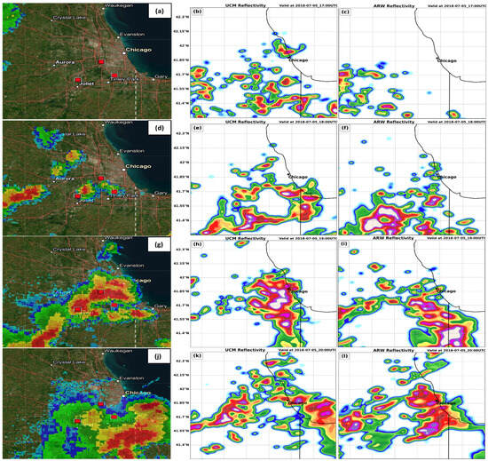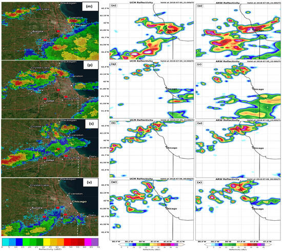 NOAA NEXRAD Doppler composite reflectivity (dBz) (left), WRF-UCM (center), and WRF-ARW (right) simulated composite radar reflectivity (fill-in dBz) valid at (a–c) 1700 UTC, (d–f) 1800 UTC, (g–i) 1900 UTC, (j–l) 2000 UTC, (m–o) 2100 UTC, (p–r) 2200 UTC, and (s–u) 2300 UTC, 5 July 2018, as well as (v–x) 0000 UTC 6 July 2018. Star indicates the location of Chicago, IL, USA.