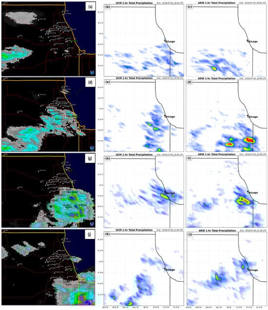 In this subsection, we qualitatively compare both simulations’ surface meteograms to the observed surface meteograms in Figure 3 and Figure 4 at the three Chicago metropolitan airports and the NWS Romeoville Forecast Office, whose locations are depicted in Figure 2 in this manuscript as well as in Figure 2 in Part I []. We will also subjectively compare NOAA NEXRAD composite reflectivity and hourly precipitation to both simulations’ composite reflectivity and hourly precipitation. We do so to establish which simulation best replicates the observations, although both simulations have errors.