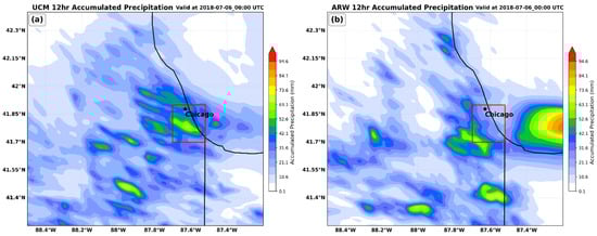 In summary, the UCM is much faster and farther east in its simulation of precipitation, with the ARW lagging significantly in reality. This likely reflects the much more accurate surface heating cycle that the UCM simulates, particularly in the area roughly centered on KMDW, which allows the UCM to produce more robust near-surface convergence in response to increased surface heating, stronger low-level pressure falls, stronger low-level jet convergence, and upper-level divergence; these are outlined in the subsection on the simulations’ inter-comparison. A comparison of the 1 km grid’s total precipitation in both simulations in Figure 9 indicates that the UCM produces more precipitation in the downwind part of the city (rectangle box area), which is in accordance with many published simulation studies described in the introduction and with observational studies in Part I [], in which downwind of the city the precipitation is enhanced by the UHI. Quantitative analysis also confirms this spatial pattern in Figure 9, with WRF-UCM producing 42.6% more accumulated precipitation than WRF-ARW in the defined downwind region (Figure 10). This result reinforces the role of urban land surface processes in enhancing localized convective rainfall. Although the short period of pressure falls and rises, it is not accurately replicated in both simulations, being far too long and far too flat in both.