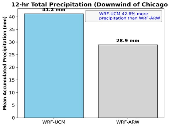 Bar chart of mean 12 h accumulated precipitation in the downwind region of Chicago in WRF-UCM and WRF-ARW simulations.