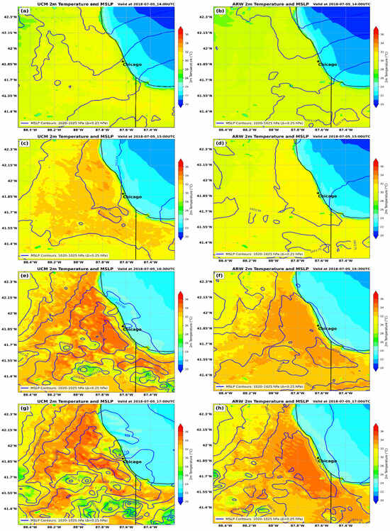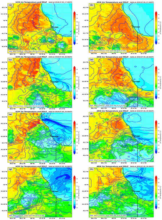 WRF-UCM (left) and WRF-ARW (right) simulated the 2 m temperature (fill in °C) and mean sea level pressure (MSLP, solid in hPa) valid at (a,b) 14007/5, (c,d) 15007/5, (e,f) 16307/5, and (g,h) 17007/5. Star indicates the location of the center of Chicago, IL, USA.