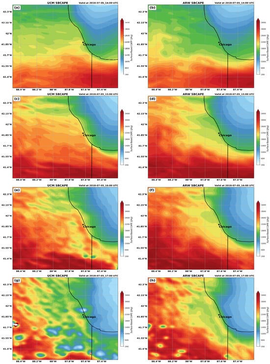 WRF-UCM (left) and WRF-ARW (right) simulated SBCAPE (fill in J kg−1) valid at (a,b) 14007/5, (c,d) 15007/5, (e,f) 16007/5, and (g,h) 17007/5. Star indicates the location of the center of Chicago, IL, USA.