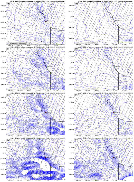 In response to this low-level mass adjustment associated with the meso-low, during 16007/5–17157/5 period, three near-surface wind maxima became organized in the UCM while still largely missing or weaker in the ARW, as can be seen at 15307/5–16307/5 in Figure 13c,e,g. Most notable is the penetration of the lake breeze onshore into the strip of higher SBCAPE (Figure 12e) along the lakefront, but also evident is the strengthening of the north–northwesterly jet on the west side of the metroplex and the west–southwesterly jet on the southwestern and southern sides of the metroplex. The much more rapidly developing and stronger signals of these jets in the UCM, particularly the inland penetration of the lake breeze several kilometers more than the ARW just south of the Loop, near the center of the city, and directed at KMDW 1–2 h earlier, are a response to urban heating-induced mean sea level pressure decreases (meso-low genesis) and PBL wind accelerations centered near this hottest airport location, i.e., KMDW, as seen in Figure 11g,h and Figure 13g,h. Also, in Figure 13e,g, the evolution of 975 hPa convergence aligning nicely with maxima approaching or exceeding 10−4 s−1 in roughly a triangular pattern, generally surrounding KMDW to the south, west, and north, i.e., from northwest of the city to north–northeast of the city, thus narrowing southeast of the city towards the northern Illinois–Indiana border near the lakefront. It is important to reiterate that such a pattern is representative of the early developing radar echoes, as depicted in Figure 7h at 1900 UTC. This triangular pattern is evident in the 975 hPa convergence in both simulations but is much earlier and better defined in the UCM as it tapers to a point north of the Illinois–Indiana border and is widest roughly west of the Loop, possibly reflecting the more rapid meso-low genesis in the UCM. Figure 11g highlights the meso-low/-high couplet roughly centered on this triangular convergence pattern with the 1022 hPa low and 1024 hPa high within ~20 km of each other in the UCM but at least an hour or more ahead of the ARW. As can be seen in Figure 11g,h, Figure 12g,h and Figure 13e, the UCM can develop a triangular set of convergence maxima nearly one order of magnitude larger than the ARW, shifting the convective triggering to an earlier time and expanding its coverage eastwards.