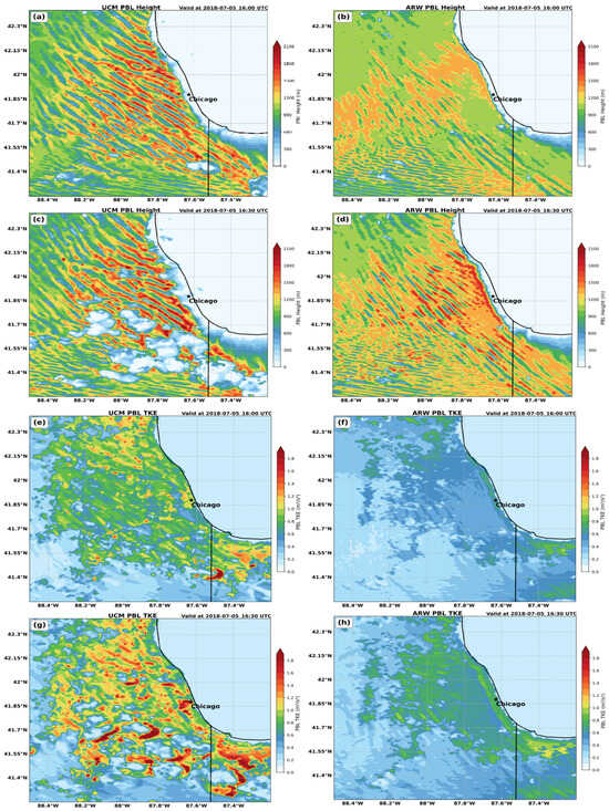 WRF-UCM (left) and WRF-ARW (right) simulated PBL height (fill-in m) valid at (a,b) 16007/5 and (c,d) 16307/5, and the PBL Turbulent Kinetic Energy (TKE; fill-in m2s−2) valid at (e,f) 16007/5 and (g,h) 16307/5. Star indicates the location of Chicago, IL, USA.