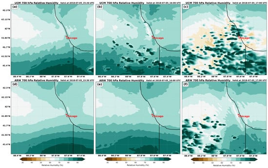 WRF-UCM (top) and WRF-ARW (bottom) simulated 700 hPa relative humidity (fill in %) valid at (a,d) 15307/5, (b,e) 16007/5, and (c,f) 17007/5. Star indicates the location of Chicago, IL, USA.