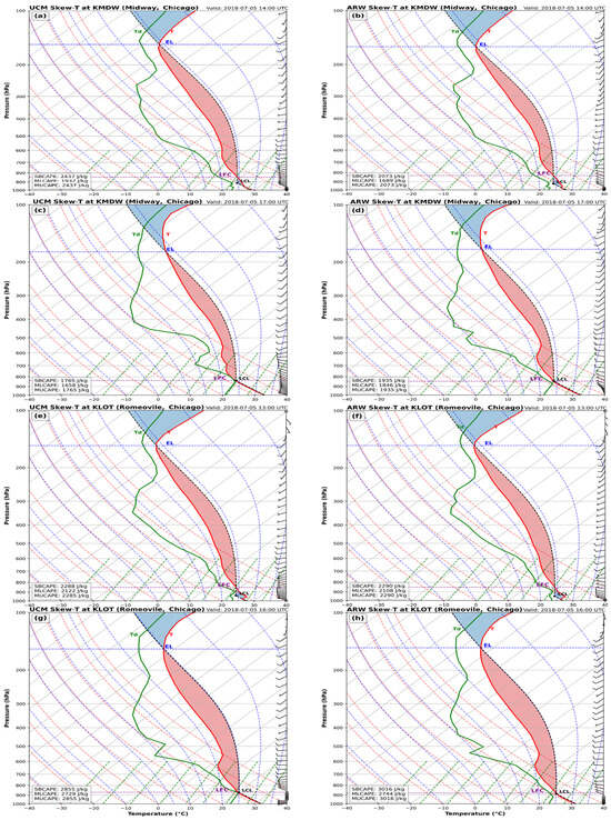 WRF-UCM (left) and WRF-ARW (right) Skew-T diagrams for and valid at (a,b) KMDW 14007/5, (c,d) KMDW 17007/5, (e,f) KLOT 13007/5, and (g,h) KLOT 16007/5.