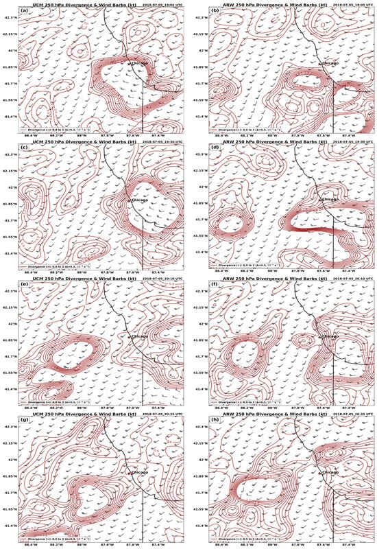 WRF-UCM (left) and WRF-ARW (right) simulated 250 hPa divergence (solid brown 10−4 −1) and wind barbs (kt) valid at (a,b) 19057/5, (c,d) 19307/5, (e,f) 20107/5, and (g,h) 20357/5.