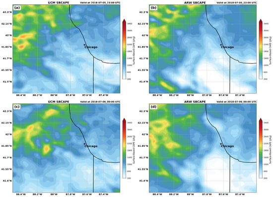WRF-UCM (left) and WRF-ARW (right) simulated SBCAPE (fill in J kg−1) valid at (a,b) 23007/5 and (c,d) 00007/6.