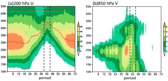 Time-latitude distributions of the 1961–2020 mean 200 hPa zonal wind (a) and 850 hPa meridional wind (b) averaged for 110–122.5° E (unit: m·s−1, only positive values are shown). The black dashed lines indicate mid-summer period; the red solid line in (a) indicates the position of the westerly jet axis.