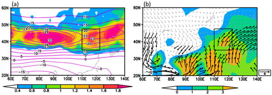 Climatological-mean (1961–2020) characteristics of mid-summer circulation fields over East Asia. (a) Occurrence frequency percentage of 200 hPa westerly jet core (shaded, unit: %) and zonal wind speed (contours, unit: m·s−1); (b) 850 hPa wind vectors (unit: m·s−1, black vectors indicate speeds larger than 3 m·s−1) and meridional wind speed (shaded, unit: m·s−1). Black rectangles indicate the key area of westerly–monsoon interaction.