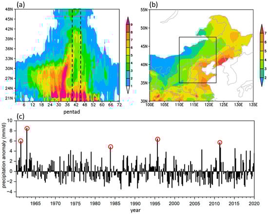(a) Time-latitude distribution of the 1961–2020 mean pentad precipitation rate averaged for 110–122.5° E (unit: mm·d−1); (b) The 1961–2020 mean precipitation rate during mid-summer (unit: mm·d−1); (c) Pentad (40th–45th pentad in each year) precipitation rate anomalies averaged for NC in mid-summer from 1961–2020 (unit: mm·d−1). The dotted lines in (a) indicate 40th–45th pentad. The black rectangle in (b) indicates NC region. The red circles in (c) indicate the pentad extreme precipitation cases.