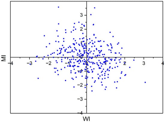 To explore the synergistic effect of midlatitude westerlies and EASM, we identified different concurrent configurations of these circulation systems. In each year, the mid-summer period is defined as the 40th–45th pentad, totaling 360 pentads spanning from 1961–2020. The pentad mean westerly index (WI) is obtained by averaging the 200 hPa zonal wind within the NC domain and was standardized. Similarly, the pentad mean monsoon index (MI) is calculated using the 850 hPa meridional wind. Figure 4 presents the pentad intensity index for WI versus MI, and the correlation coefficient between them is −0.19. Following Zhang and Chen [], two in-phase configurations are identified using ±0.5 standard deviations as follows: (1) strong westerly and EASM configuration (WI ≥ 0.5 and MI ≥ 0.5, denoted as SS) and (2) weak westerly and EASM configuration (WI ≤ −0.5 and MI ≤ −0.5, denoted as WW). There are 20 and 27 pentads corresponding to SS and WW configurations during the mid-summer period of 1961–2020.
