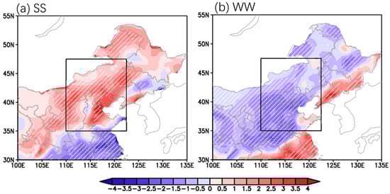 The spatial distribution of the composite mid-summer rainfall anomalies over NC under different configurations of WI-MI is presented in Figure 5. Under the SS configuration (Figure 5a), pronounced positive precipitation anomalies are evident across NC, Northeast China, and eastern parts of Northwest China, while negative precipitation anomalies are observed throughout Southern China south of 35° N. The maximum positive rainfall anomaly center is located in eastern Hebei and eastern Inner Mongolia, where precipitation rate anomalies exceed 4 mm·d−1 and rainfall anomaly percentages surpass 80% (Figure S1a). Conversely, under the WW configuration (Figure 5b), negative precipitation anomalies predominate across NC. The negative anomaly center is situated in the southwest of NC, with precipitation rate anomalies exceeding −3.5 mm·d−1 and rainfall anomaly percentages ranging from −60% to −40% (Figure S1b).