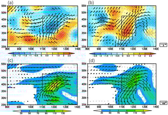 Lower-tropospheric mid-summer circulation composited for SS (a,c) and WW (b,d) pentads. (a,b) Anomalies of 850 hPa wind (vectors, unit: m·s−1) and 500 hPa vertical velocity (shaded, unit: 0.01 Pa·s−1); (c,d) Anomaly of integrated moisture flux from surface to 700 hPa (vectors, shaded areas indicate the magnitude of moisture flux anomalies, unit: kg(m·s)−1). Black vectors and hatched areas indicate passing the two-tailed t test at 10% significant level. The black rectangles indicate NC region.