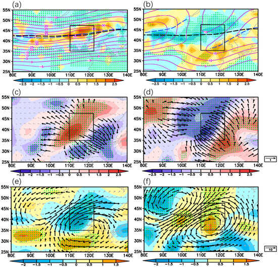 Meanwhile, circulation anomalies induced by the concurrently weakened westerly and EASM (WW configuration, Figure 6b,d) exhibit completely contrasting features. An anomalous anticyclone–cyclone pair over the Mongolian Plateau and Yellow Sea induces anomalous northeasterly flows and easterly–northeasterly water vapor flux anomalies across NC. These northerly water vapor fluxes over NC weaken the climatological southwesterly water vapor transport patterns and inhibit northward moisture advection toward NC, creating conditions unfavorable for precipitation development.