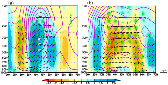 Composite latitude-height (averaged in 110–120° E) cross-section distribution of meridional and vertical velocity anomalies (shaded for omega, unit: −0.01 Pa s−1; vectors for vertical component scaled by 100, unit: m·s−1) and zonal wind (purple contour, unit: m·s−1) in SS (a) and WW (b) configurations. Black vectors and dotted areas indicate passing the two-tailed t test at 10% significant level.