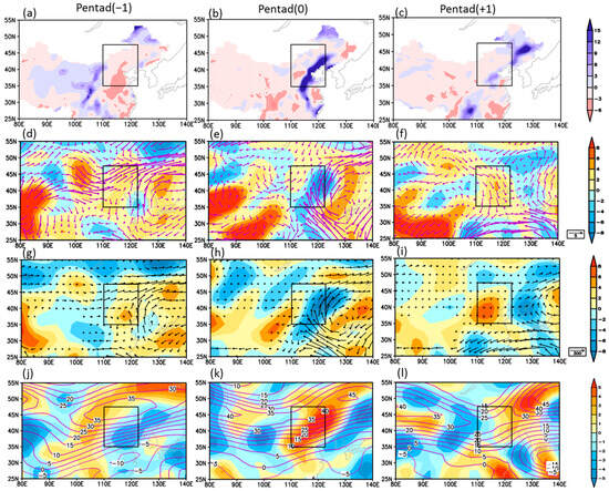 At pentad 0, during the peak of the extreme precipitation event, the Japan Sea anticyclone migrates westward to the Yellow Sea and intensifies significantly (Figure 9e). Concurrently, both the EASM and westerly winds strengthen significantly. The anomalous cyclone–anticyclone pair develops prominently over Mongolia and the Yellow Sea. Enhanced southerlies to the west of the Yellow Sea anticyclone facilitate continuous monsoon-driven water vapor transport into NC (Figure 9h), thereby creating favorable moisture conditions for extreme precipitation. Meanwhile, the upper jet core intensifies and shifts eastward, positioning NC in the southern entrance of the jet stream where pronounced upper-level divergence develops (Figure 9k). This upper-level divergence acts as an upper “pumping”, generating vigorous ascending motion in southeastern NC that directly contributes to extreme precipitation formation. At pentad +1, the cyclone–anticyclone pair shifts eastward towards northeast China and the Japan Sea (Figure 9f). Northerlies developing along the western periphery of the cyclone dominate over NC, indicating the weakening of the EASM. In addition, the westerly jet core migrates northeastward along its axis, resulting in reduced westerlies over NC (Figure 9l). Consequently, the resultant subsidence associated with the concurrent weakening of both westerlies and EASM leads to suppressed rainfall across NC.