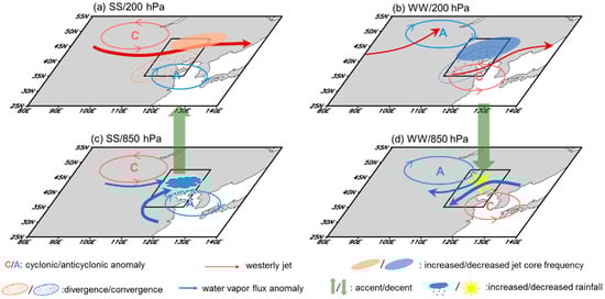 (2) The underlying mechanism of westerly-monsoon synergistic effects on mid-summer precipitation in NC is proposed (Figure 10). Concurrently strong westerly and EASM stimulate an anomalous quasi-barotropic cyclone–anticyclone pair that extends from the Mongolian Plateau to the Yellow Sea. This anomaly pair establishes two anomalous water vapor channels: the westerly-driven channel along the southern periphery of the cyclonic anomaly and the EASM-driven channel along the western periphery of the anticyclonic anomaly, with the latter exhibiting greater intensity than the former. These dual water vapor channels create favorable moisture conditions for precipitation by directing ample water vapor into NC. Meanwhile, the strengthened westerlies lead to increased frequencies of westerly jet cores and establish a pronounced jet entrance zone over northern NC. Along the southern side of this jet core entrance region, significant upper-level divergence develops, acting as a “pumping effect” that triggers deep vertical accents throughout the troposphere. This upper-level divergence and associated vertical accents provide favorable dynamic conditions for abundant rainfall development. Therefore, in mid-summer, the westerly–EASM synergy enhances both water vapor transport in the lower layers and strengthens dynamic uplift in the upper troposphere, leading to excessive precipitation across NC.