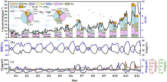 Time series of (a) chemical composition (left: daytime, right: nighttime) and PM2.5 concentrations, (b) RH, temperature, and (c) gaseous pollutants concentrations at Dianshan Lake. The pie charts in (a) show the average chemical composition at daytime and nighttime.