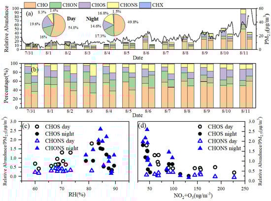 (a) Relative abundance of CHO, CHON, CHOS, CHONS, and CHX and their proportions in total abundances (left: daytime, right: nighttime), with time series of PM2.5. Note that the cumulative relative abundance for the August 11 daytime sample (the highest of all the samples) was set arbitrarily to 100%. The pie charts show the average organic compounds composition at daytime and nighttime. (b) Abundance proportion of detected organic compounds (left: daytime, right: nighttime). (c) The relationships between relative abundances of CHOS and CHONS in PM2.5 with RH. (d) The relationships between relative abundances of CHOS and CHONS in PM2.5 and oxidizing gases (O3 + NO2).