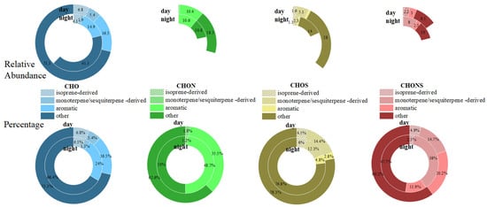 Relative abundances and proportional contributions of isoprene-derived, monoterpene/sesquiterpene-derived, aromatic, and others within CHO, CHON, CHOS, and CHONS compounds.
