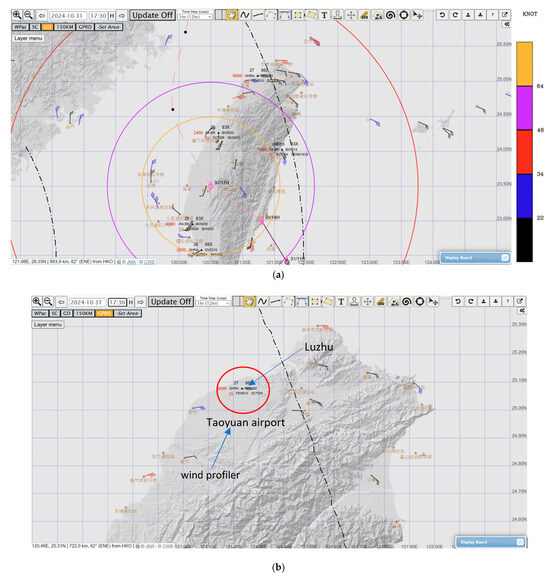 Surface meteorological observations of Taiwan taken around 09:30 UTC on 31 October 2024 (a), and an enhanced image taken near the airport (b). The red circle indicates the location of Taoyuan International Airport. The colors of the wind barbs refer to the category of wind speed. The colored circles depict the radii of different wind categories. The dotted circles denote the distances from Hong Kong.