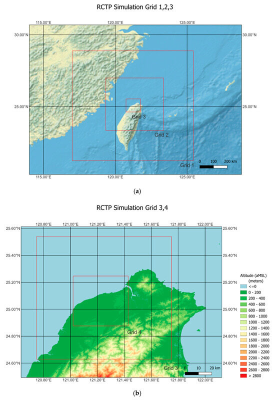 To study the impact of terrain, the simulation method adopted for HKIA (Chan et al., 2021) [5] is applied to Taoyuan International Airport in this case. Four model domains are used here, with the innermost domain having a spatial resolution of 200 m. The model used is the Regional Atmospheric Modeling System (RAMS) version 6.3, nested with the global NWP model of the National Centers for Environmental Prediction (NCEP). The choice of turbulence parameterization is crucial in the simulation. The Smagorinsky (1963) [6] scheme is chosen for domains 1 and 2, and the Deardorff (1980) [7] scheme is chosen for domains 3 and 4. The spatial coverage of the four model domains is shown in Figure 5a,b. The model was initialized at 06 UTC, 31 October 2024, and run for four hours.