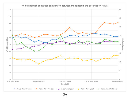 Figure 7b shows that, at around 09:35 UTC, 31 October 2024, which is the main time of interest, the simulated and measured wind speeds differ by about 4 to 5 m/s. This difference may be speculated to arise from the initial difference between the two datasets at 06 UTC. Two more model runs were performed, initialized at 03 UTC, 31 October 2024, and 09 UTC, 31 October 2024. The results from the two datasets at around 09:35 UTC remain similar. As inferred from the metadata for Luzhu station, the difference may be attributable to the station’s exposure. Moreover, the numerical simulation may have limitations related to the availability of high-resolution land use/land cover (LULC) data around the airport, which could contribute to the difference between the measured and simulated results.