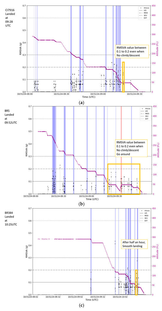 RMSVA data for the flight before JX871, i.e., CI7916 (a), and two flights after, i.e., BR5 (b) and BR 384 (c). Orange areas highlight periods with no climb/descent but still light turbulence.