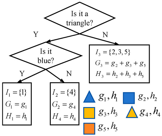 For the branching principle mechanism of the EG-Tree, in this study, it is designed to be based on feature evaluation. After the total sample is input into the model, the model first identifies the most significant features and then classifies the data based on their characteristics. During the secondary selection process, the data are partitioned based on the next most significant features, with the overall process illustrated in the figure. In the diagram, triangles represent the unidirectional paths for data flow or gradient transmission, while squares denote the physical storage units for feature Blocks. The carbon emission levels are ranked in descending order as red (highest), followed by yellow, and then blue (lowest). Blue triangles correspond to the values g1 and h1, blue squares to g2 and h2, yellow squares to g3 and h3, yellow triangles to g4 and h4, and red squares to g5 and h5. The overall workflow in Figure 2 proceeds as follows: first, the shape is checked to determine if it is a triangle; if so, it is further evaluated for the color blue—if blue, the output is I1 = {1}, G1 = g1, and H1 = h1; if not blue, the output is I2 = {4}, G2 = g4, and H4 = h4. If the shape is not a triangle, the output is I3 = {2, 3, 5}, G3 = g2 + g3 + g5, and H3 = h2 + h3 + h5.
