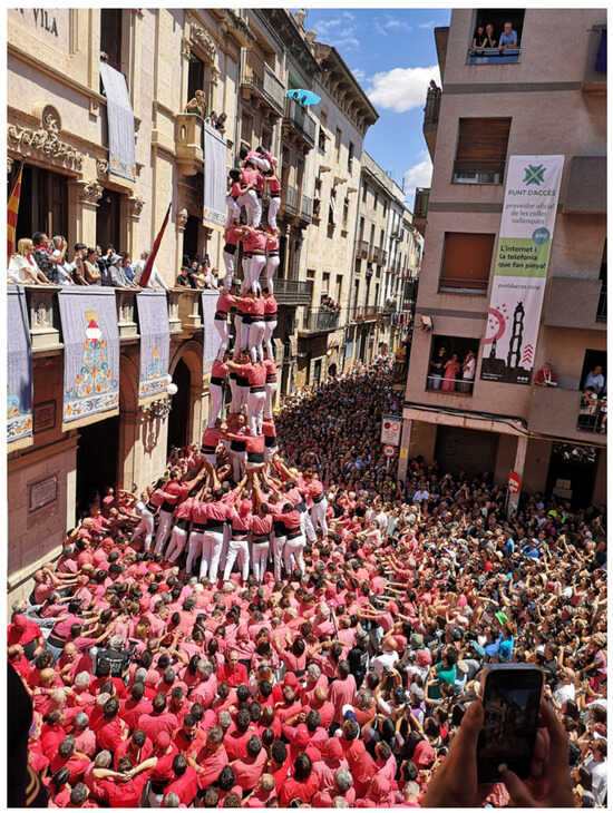 Global warming and the increasing frequency and intensity of heat waves are resulting in more frequent unfavourable weather conditions for outdoor activities, especially those involving high-intensity efforts during the summer, leading to a decrease in outdoor physical activities [,,,,]. Human towers (castells) are a physical activity that typically takes place outdoors in a town (Figure 1). The goal is to adopt different structures, all of which feature a central column called the trunk that is at least one human tower builder (casteller) wide. The tallest human tower ever built has ten tiers. A tight group of castellers known as the core surrounds the base of the trunk to provide stability [].