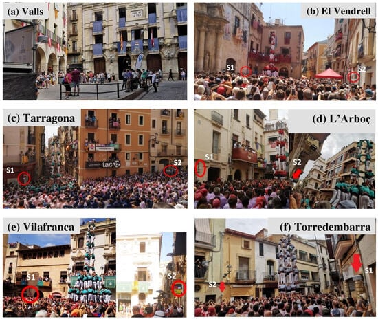 Table 3 displays details about the geometry, surface, and capacity of the squares according to Brotons Navarro and Soler García de Oteyza []. The authors provided comprehensive information about 17 squares in which human tower exhibitions take place around Catalonia; their information also includes the perimeter, slope, number of facades, type of pavement, number of access points, and floor plan of the square, among other details.