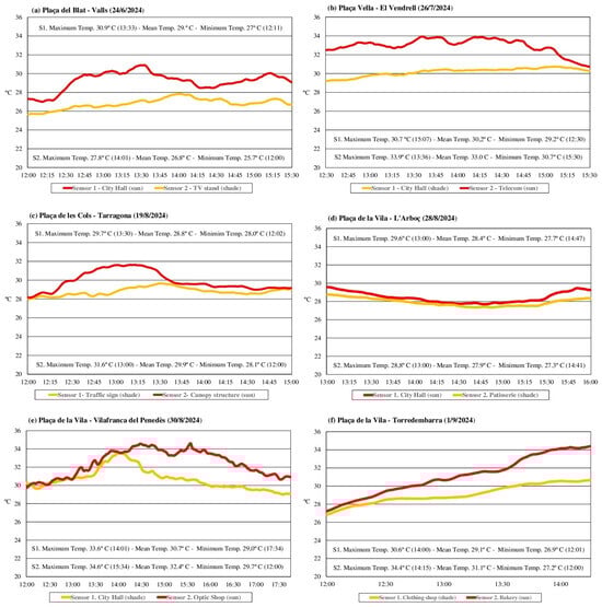On 30 August 2024, the mean temperature in Plaça de la Vila (Vilafranca del Penedès) during the exhibition was 30.7 °C on Sensor 1 and 32.4 °C on Sensor 2. Both sensors began the exhibition in the shade, and the temperatures remained stable at around 30 °C. The temperature increased once the sensors were exposed to solar radiation. Sensor 1 was shaded again by the surrounding buildings around 14:00 (85% of the time) when it reached its maximum temperature (33.6 °C). Sensor 2 remained exposed to solar radiation (85% of the time), reaching its peak temperature at 15:30 (34.6 °C); the temperature on this sensor hovered around 34 °C from 14:30 to 15:30.