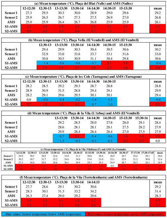 Table 4 depicts the analysis of the differences between the sensor data and the corresponding measurements from the nearest AMS. The application of the Shapiro–Wilk test reveals that the distribution of temperatures is similar to the normal distribution, with the exception of Vilafranca-S1. In that case, we applied the Wilcoxon test to determine if the differences were statistically significant. The differences between the sensors and AMS data were found to be statistically significant at different levels in eight cases. The differences were not statistically significant in L’Aborç-S1/S2 (cloudy day), El Vendrell-S1 (shade) and Tarragona-S2 (sun).