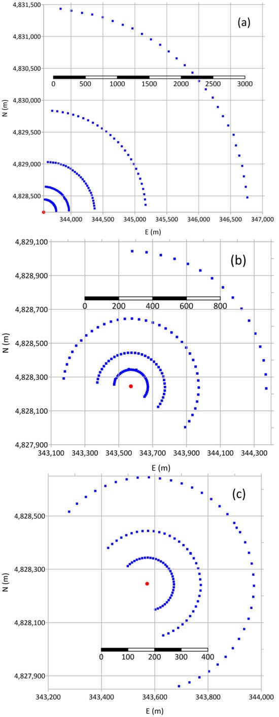 The positions of the discrete receptors (sampling sites) used to validate the models in this study are represented in Figure 1 by means of blue squares, while the red circle represents the source location. All the receptors are placed at 1 m agl. It is noted that the three panels of Figure 1 have different scales. During PSB1 (Figure 1a), the receptors placed from 400 m to 3200 m from the source were used for IOP1-3, while the receptors placed from 200 m to 1600 m from the source were used for IOP4-5. Concerning PSB2, the receptors used in convective conditions during the summer (IOP1-4) are shown in Figure 1b, while those used in stable conditions during the nights or in the late afternoon of October are shown in Figure 1c.