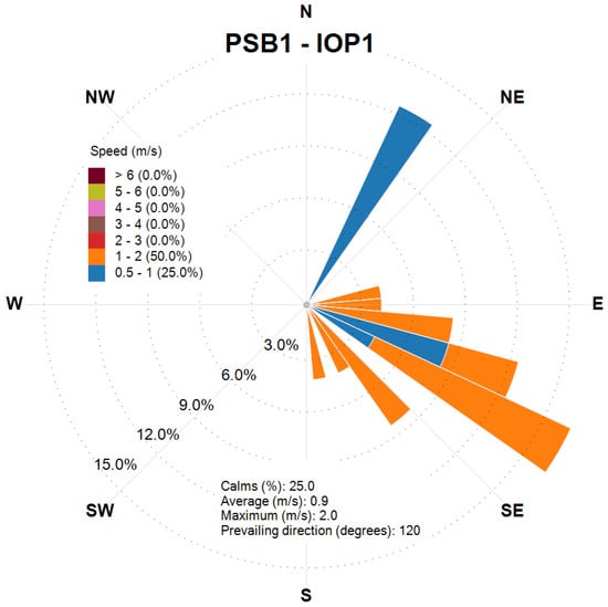As described above, a lot of meteorological instrumentation was present within and around the area of study. Therefore, considering also that the area is practically flat, the meteorological fields during the IOPs were determined using only the CALMET diagnostic meteorological model [21]. An alternative procedure would be, for example, to use—in addition to CALMET or alone—a prognostic meteorological model like WRF [11], as performed for example in [10,13]. However, in this work it is assumed that, over such a small area, the meteorological fields can be reliably reproduced using the extensive meteorological measurements that were carried out in PSB.